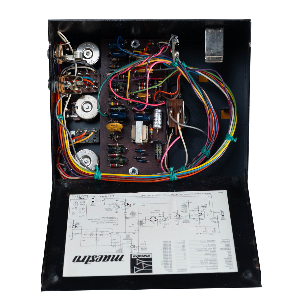 両側面にある2つのネジを緩めれば、裏蓋が上記写真のように開きます。内部の作りは非常に丁寧で、例えば基板上の抵抗の向きが全て揃えられています。そういったことは当時のヴィンテージペダルではほとんど見られません。生産に気を遣われていたことが想像できます。
