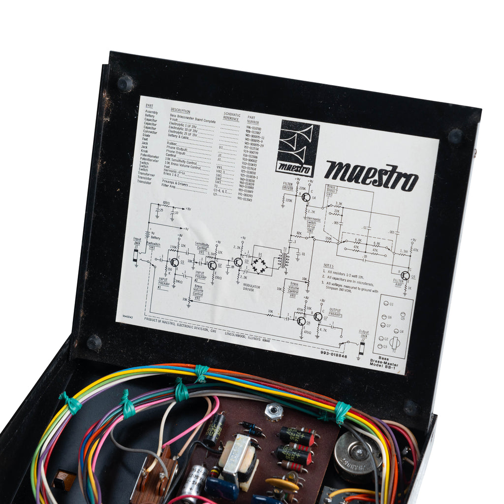 「他に見ない回路」、「定格の大きな部品ばかりが使われている」、「当時のペダルとしては明らかに丁寧に作られている」、こういったことからもBass Brassmasterの唯一無二の音が作られているのでしょう。Bass BrassmasterをはじめとするMaestroのエフェクターの多くはATDという会社が製造を請け負っていましたが、Bass Brassmasterは特に丁寧に作られているように見えます。