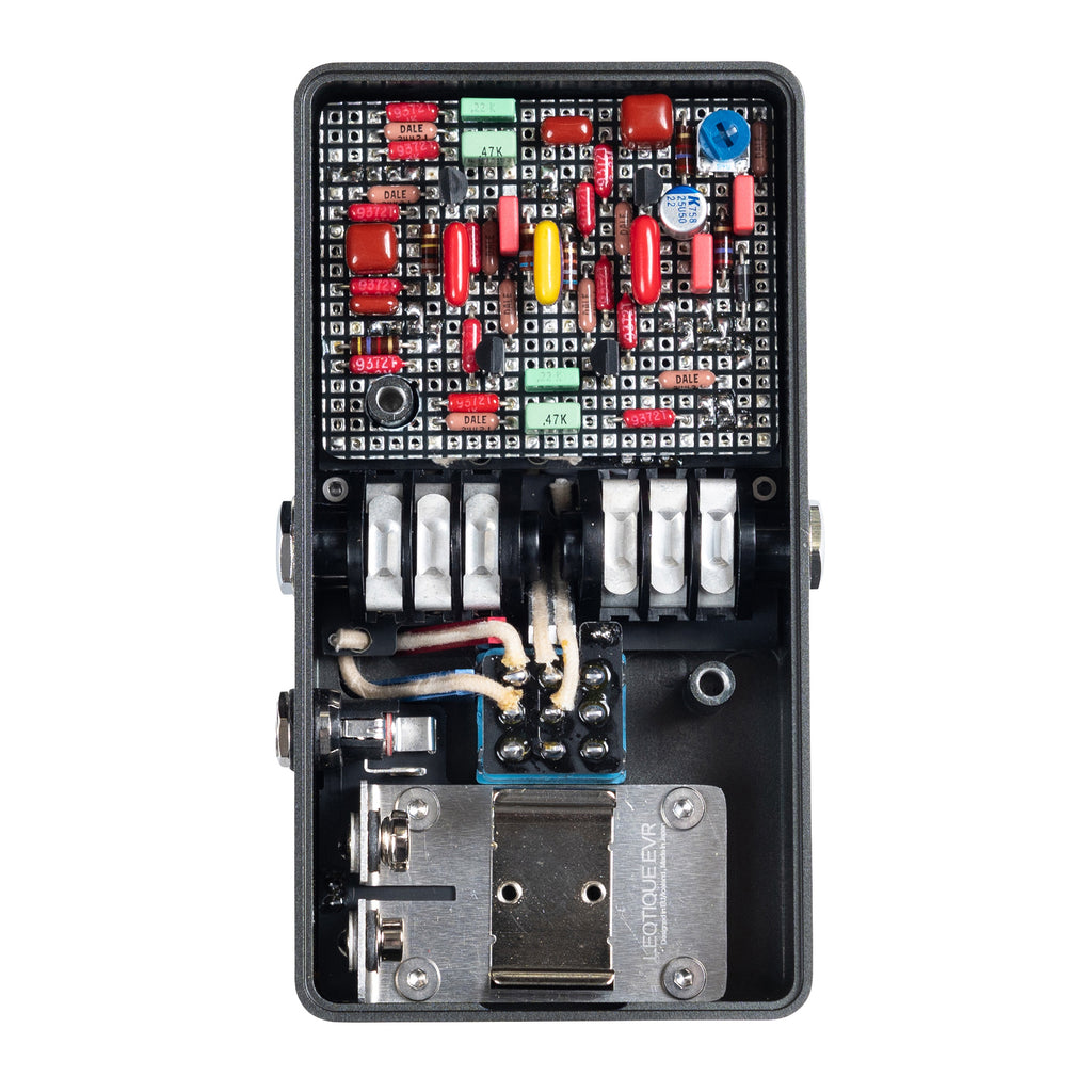 ペダルの内部でも、Leqtique EVRとPhantom fxの個性が見事に融合しています。基板部をPhantom fxがポイント・トゥ・ポイントで製作し、その基板をLeqtique EVRの精密なフォーマットに組み込むことで、完成しています。